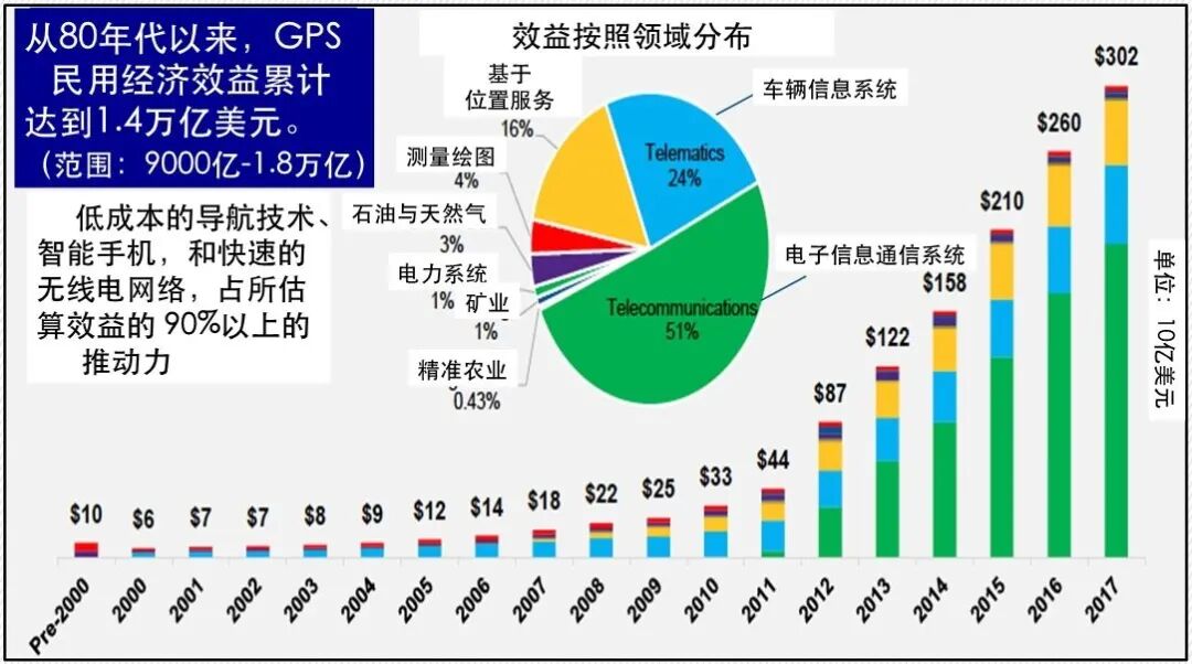 北斗、GPS、格洛纳斯和伽利略在现代化和后发优势的建设运营中,不断更新和优化技术,在应用服务中不断增强,不断进步。而卫星导航产业及其衍生产业,在不断壮大,不断融合创新中实现高质量发展。美国在2019年发表的GPS效益分析报告表明,实际上从2012年开始,美国导航产业才真正进入蓬勃发展的阶段,从2012年的年效益的870亿美元,至2017年增长至3020亿美元,平均每年增长430亿美元。从1984年开始累积计算,最近六年的产值占有总效益累积值的80%以上,说明真正的卫星导航产业是在多国各自建设运营自己的系统,产业发展形成良好的氛围和产业链生态环境条件下,才能有长足发展。特别是低成本的导航技术、智能手机、汽车车辆、共享单车、电动车、无人机、电信网络、位置服务,这些与大众化消费产品结合起来,产业才能够高速健康持续发展。